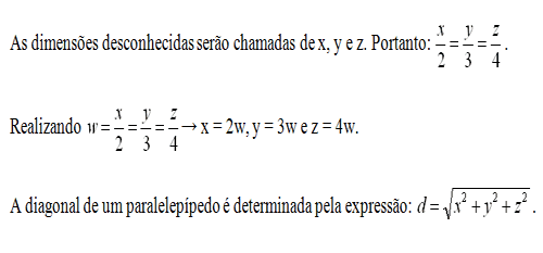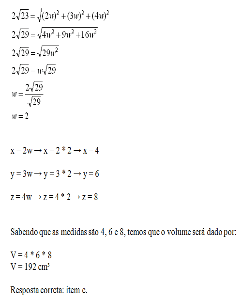 As medidas das arestas de um paralelepípedo retângulo são proporcionais a 2, 3 e 4. Se sua diagonal mede 2√29 cm, seu volume, em centímetros cúbicos, é: