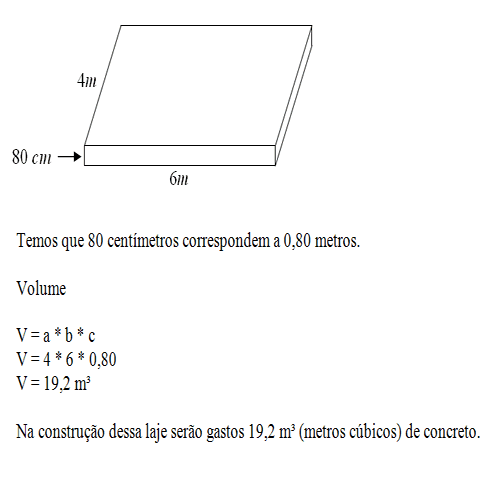 Qual o volume de concreto utilizado na construção de uma laje de 80 centímetros de espessura em uma sala com medidas iguais a 4 metros de largura e 6 metros de comprimento?
